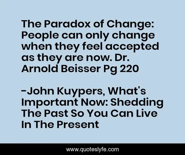 This page presents the quote "The Paradox of Change: People can only change when they feel accepted as they are now. Dr. Arnold Beisser Pg 220". Author of this quote is John Kuypers, What's Important Now: Shedding The Past So You Can Live In The Present. This quote is about change, self-improvement, inspirational, enthusiasm, happiness, present,.