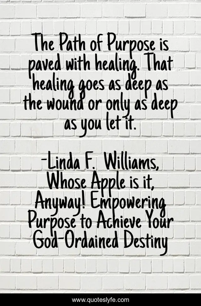 This page presents the quote "The Path of Purpose is paved with healing. That healing goes as deep as the wound or only as deep as you let it.". Author of this quote is Linda F. Williams, Whose Apple is it, Anyway! Empowering Purpose to Achieve Your God-Ordained Destiny. This quote is about motivational-inspirational, christian-living, inspirational, enthusiasm,.