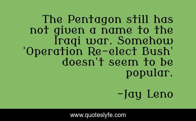 This page presents the quote "The Pentagon still has not given a name to the Iraqi war. Somehow 'Operation Re-elect Bush' doesn't seem to be popular.". Author of this quote is Jay Leno. This quote is about politics, humor,.