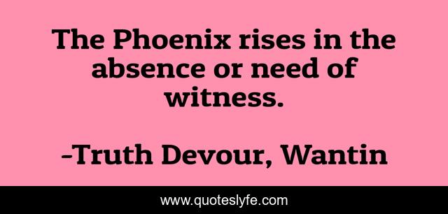 This page presents the quote "The Phoenix rises in the absence or need of witness.". Author of this quote is Truth Devour, Wantin. This quote is about independence, life-lessons,.