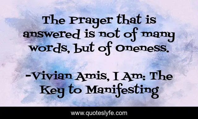 This page presents the quote "The Prayer that is answered is not of many words, but of Oneness.". Author of this quote is Vivian Amis, I Am: The Key to Manifesting. This quote is about loss, spiritual, god, metaphysical, stress, oneness, healing, prayer, new-thought,.