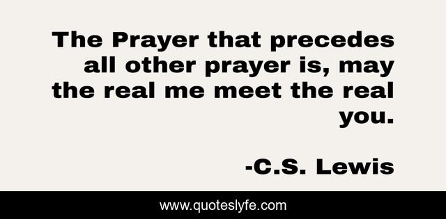 This page presents the quote "The Prayer that precedes all other prayer is, may the real me meet the real you.". Author of this quote is C.S. Lewis. This quote is about faith, religion-spiritualitygion, inspirational, enthusiasm,.