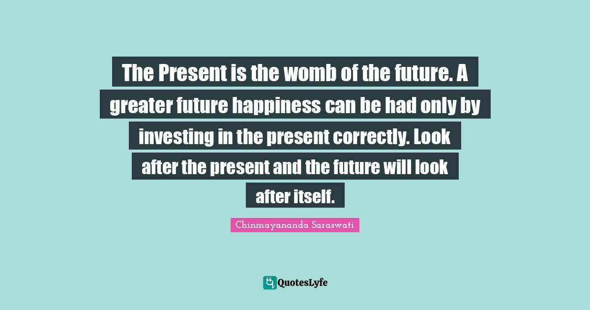 This page presents the quote "The Present is the womb of the future. A greater future happiness can be had only by investing in the present correctly. Look after the present and the future will look after itself.". Author of this quote is Chinmayananda Saraswati. This quote is about future, looks, womb, investing, greater, future happiness,.