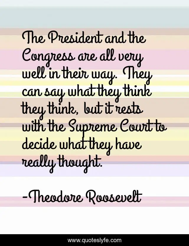 This page presents the quote "The President and the Congress are all very well in their way. They can say what they think they think, but it rests with the Supreme Court to decide what they have really thought.". Author of this quote is Theodore Roosevelt. This quote is about judiciary, supreme-court, government,.