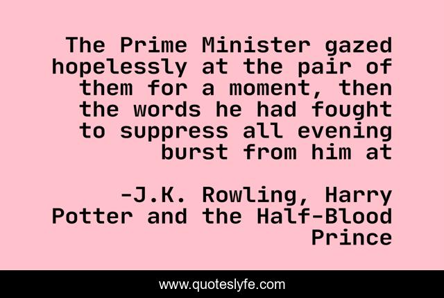 This page presents the quote "The Prime Minister gazed hopelessly at the pair of them for a moment, then the words he had fought to suppress all evening burst from him at". Author of this quote is J.K. Rowling, Harry Potter and the Half-Blood Prince. This quote is about magic, prime-minister, scrimgeour,.