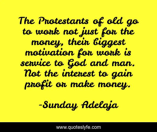 This page presents the quote "The Protestants of old go to work not just for the money, their biggest motivation for work is service to God and man. Not the interest to gain profit or make money.". Author of this quote is Sunday Adelaja. This quote is about profit, protestant, service,.