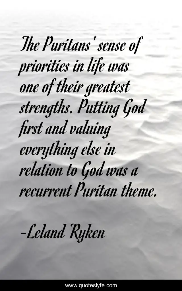 This page presents the quote "The Puritans' sense of priorities in life was one of their greatest strengths. Putting God first and valuing everything else in relation to God was a recurrent Puritan theme.". Author of this quote is Leland Ryken. This quote is about life, greatest, priorities,.