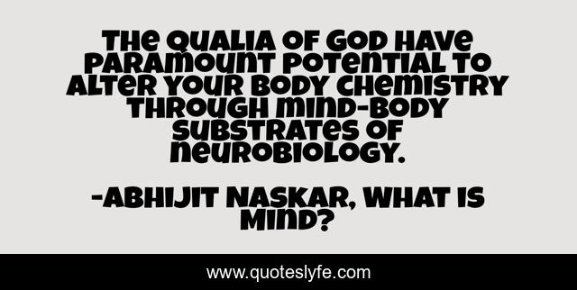 This page presents the quote "The Qualia of God have paramount potential to alter your body chemistry through mind-body substrates of neurobiology.". Author of this quote is Abhijit Naskar, What is Mind?. This quote is about confidence, religious-rituals, qualia, god, motivational, wisdom, religion, belief, optimistic,.