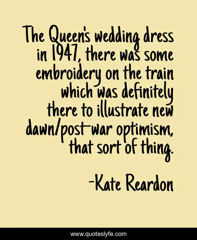 This page presents the quote "The Queen's wedding dress in 1947, there was some embroidery on the train which was definitely there to illustrate new dawn/post-war optimism, that sort of thing.". Author of this quote is Kate Reardon. This quote is about queen, dress, optimism,.