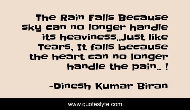 This page presents the quote "The Rain Falls Because sky can no longer handle its heaviness..Just like Tears, It falls because the heart can no longer handle the pain.. !". Author of this quote is Dinesh Kumar Biran. This quote is about love, tears, pain, affection,.