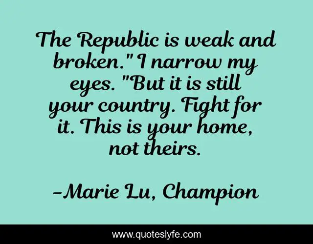 This page presents the quote "The Republic is weak and broken." I narrow my eyes. "But it is still your country. Fight for it. This is your home, not theirs.". Author of this quote is Marie Lu, Champion. This quote is about champion, day,.