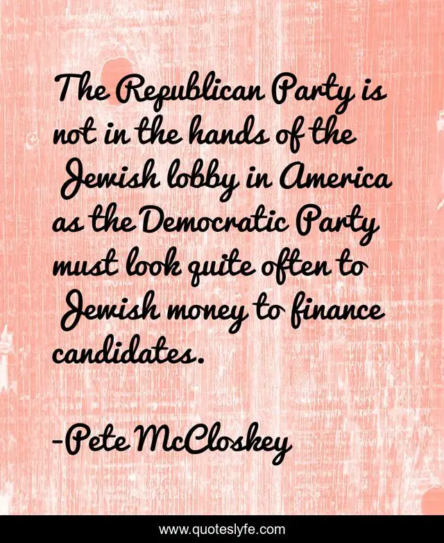 This page presents the quote "The Republican Party is not in the hands of the Jewish lobby in America as the Democratic Party must look quite often to Jewish money to finance candidates.". Author of this quote is Pete McCloskey. This quote is about money, america, hands,.