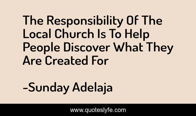 This page presents the quote "The Responsibility Of The Local Church Is To Help People Discover What They Are Created For". Author of this quote is Sunday Adelaja. This quote is about help, people, discover, responsibility, church, local,.