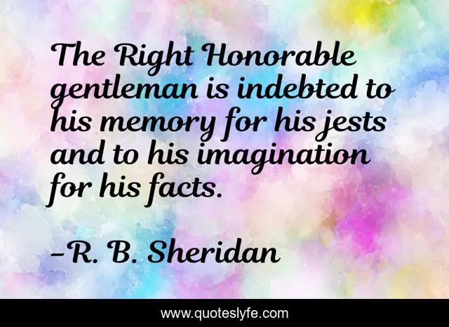This page presents the quote "The Right Honorable gentleman is indebted to his memory for his jests and to his imagination for his facts.". Author of this quote is R. B. Sheridan. .