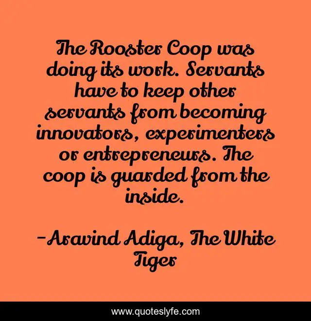 This page presents the quote "The Rooster Coop was doing its work. Servants have to keep other servants from becoming innovators, experimenters or entrepreneurs. The coop is guarded from the inside.". Author of this quote is Aravind Adiga, The White Tiger. This quote is about work, poverty, success, lower-class, innovation,.