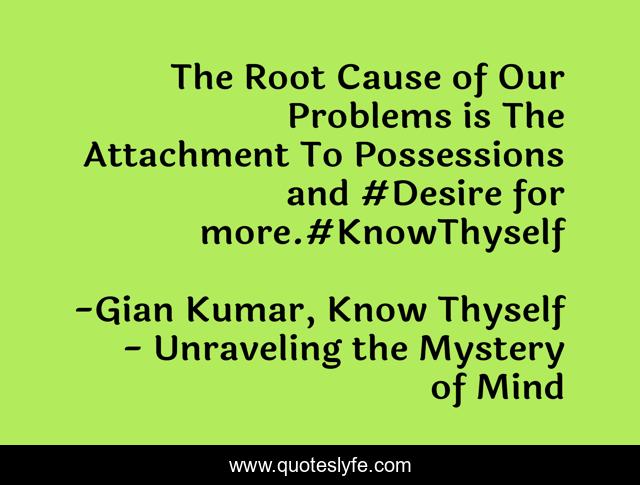 This page presents the quote "The Root Cause of Our Problems is The Attachment To Possessions and #Desire for more.#KnowThyself". Author of this quote is Gian Kumar, Know Thyself - Unraveling the Mystery of Mind. This quote is about desire, problems, attachment,.