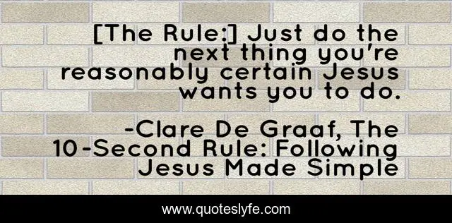 This page presents the quote "[The Rule:] Just do the next thing you're reasonably certain Jesus wants you to do.". Author of this quote is Clare De Graaf, The 10-Second Rule: Following Jesus Made Simple. This quote is about spiritual-growth, inspirational-religious, personal-growth,.