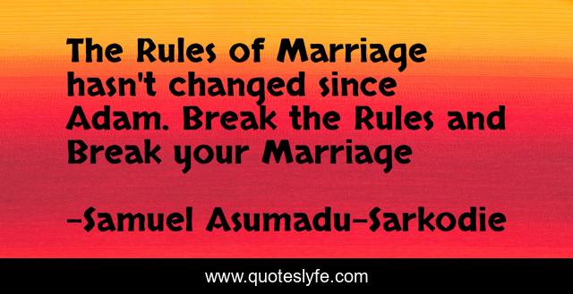 This page presents the quote "The Rules of Marriage hasn't changed since Adam. Break the Rules and Break your Marriage". Author of this quote is Samuel Asumadu-Sarkodie. This quote is about proverbs, words-of-knowledge, discernment, parables, words-of-wisdom, inspiration,.
