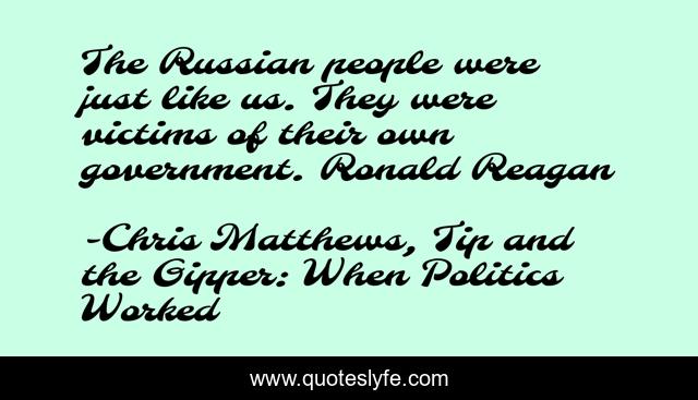 This page presents the quote "The Russian people were just like us. They were victims of their own government. Ronald Reagan". Author of this quote is Chris Matthews, Tip and the Gipper: When Politics Worked. This quote is about compassion, depravity, ministry, spiritual-warfare,.