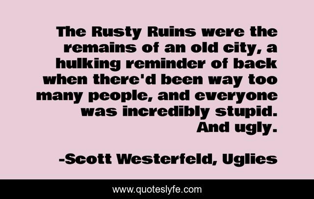 This page presents the quote "The Rusty Ruins were the remains of an old city, a hulking reminder of back when there'd been way too many people, and everyone was incredibly stupid. And ugly.". Author of this quote is Scott Westerfeld, Uglies. This quote is about funny, rusty, comedy, humor, ruins,.