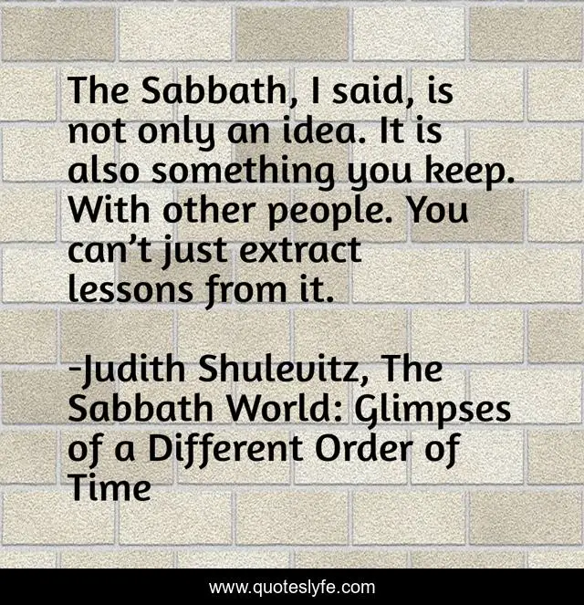 This page presents the quote "The Sabbath, I said, is not only an idea. It is also something you keep. With other people. You can’t just extract lessons from it.". Author of this quote is Judith Shulevitz, The Sabbath World: Glimpses of a Different Order of Time. .