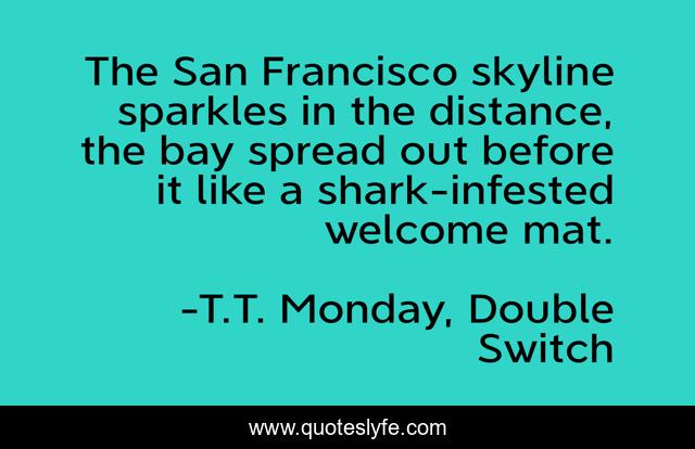 This page presents the quote "The San Francisco skyline sparkles in the distance, the bay spread out before it like a shark-infested welcome mat.". Author of this quote is T.T. Monday, Double Switch. This quote is about city, skyline, san-francisco,.