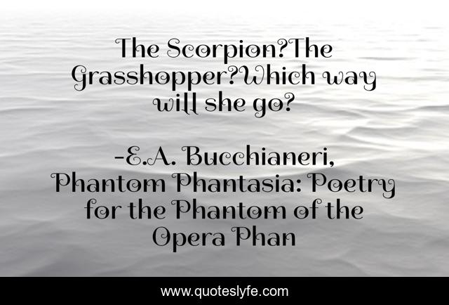 This page presents the quote "The Scorpion?The Grasshopper?Which way will she go?". Author of this quote is E.A. Bucchianeri, Phantom Phantasia: Poetry for the Phantom of the Opera Phan. This quote is about phantom, poem, grasshopper, life-and-death, opera-ghost, scorpion, poetry, poery, erik,.