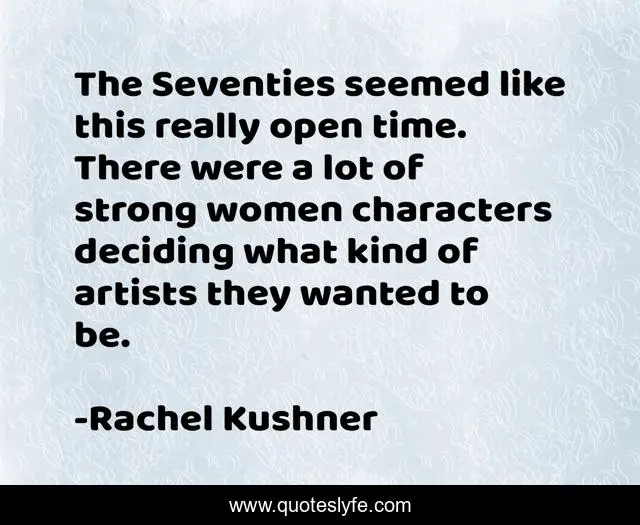 This page presents the quote "The Seventies seemed like this really open time. There were a lot of strong women characters deciding what kind of artists they wanted to be.". Author of this quote is Rachel Kushner. This quote is about kind, strong, time,.