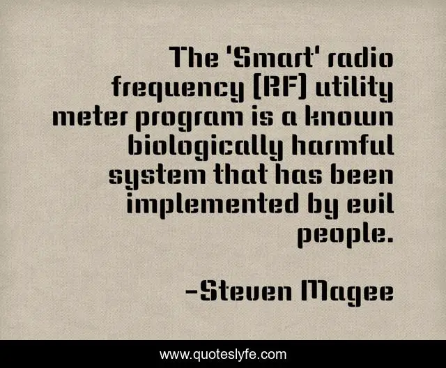 This page presents the quote "The 'Smart' radio frequency (RF) utility meter program is a known biologically harmful system that has been implemented by evil people.". Author of this quote is Steven Magee. This quote is about people, biologically, system, evil, harmful, known, rf, program, frequency,.