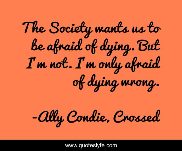 This page presents the quote "The Society wants us to be afraid of dying. But I'm not. I'm only afraid of dying wrong.". Author of this quote is Ally Condie, Crossed. This quote is about life, crossed, dying, mortality,.