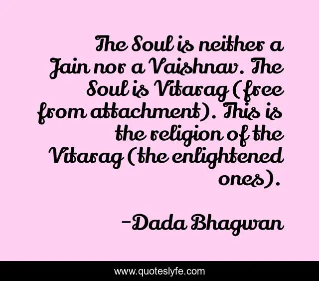 This page presents the quote "The Soul is neither a Jain nor a Vaishnav. The Soul is Vitarag (free from attachment). This is the religion of the Vitarag (the enlightened ones).". Author of this quote is Dada Bhagwan. This quote is about spiritual, self, vitarag, soul, free-from-attachment, religion, attachment, jain, enlightened-one,.