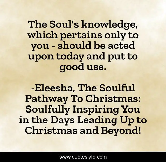 This page presents the quote "The Soul's knowledge, which pertains only to you - should be acted upon today and put to good use.". Author of this quote is Eleesha, The Soulful Pathway To Christmas: Soulfully Inspiring You in the Days Leading Up to Christmas and Beyond!. This quote is about christmas-spirit, positive, motivational, empowerment, soul, quotes, channeling, inspirational, affirmations,.