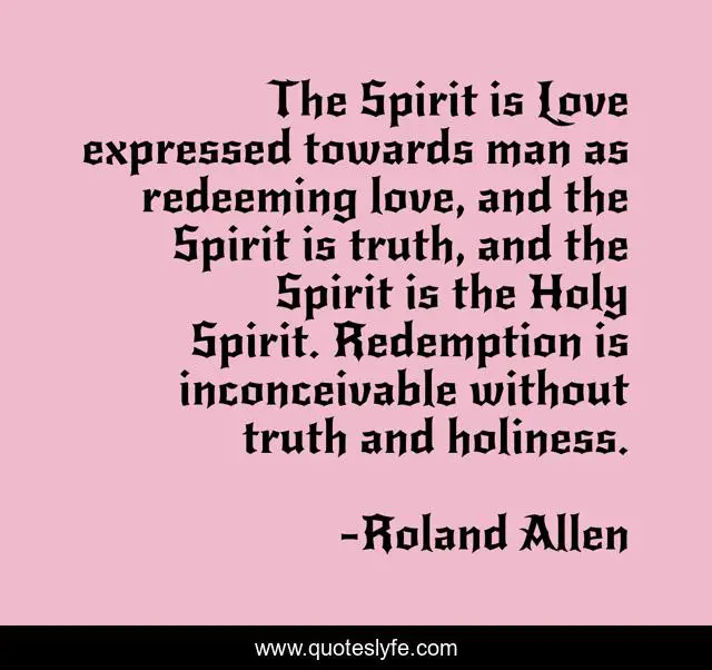 This page presents the quote "The Spirit is Love expressed towards man as redeeming love, and the Spirit is truth, and the Spirit is the Holy Spirit. Redemption is inconceivable without truth and holiness.". Author of this quote is Roland Allen. This quote is about love, redemption, affection, man,.