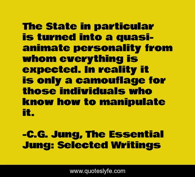 This page presents the quote "The State in particular is turned into a quasi-animate personality from whom everything is expected. In reality it is only a camouflage for those individuals who know how to manipulate it.". Author of this quote is C.G. Jung, The Essential Jung: Selected Writings. This quote is about psychology, freedom, philosophy, society, state, the-self, welfare, services, politics,.