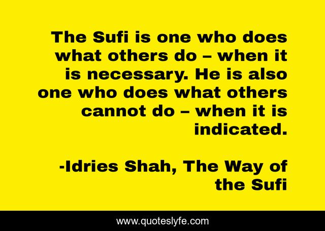 This page presents the quote "The Sufi is one who does what others do – when it is necessary. He is also one who does what others cannot do – when it is indicated.". Author of this quote is Idries Shah, The Way of the Sufi. This quote is about evolution, psychology, sufi-way, sufism, master, sufis, teacher,.