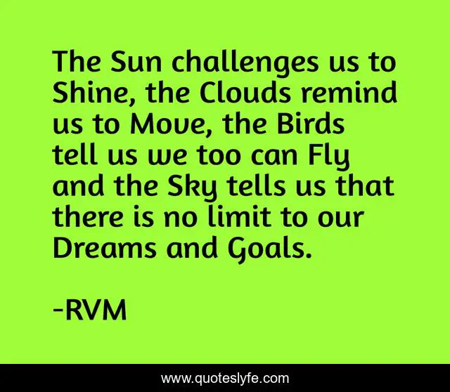 This page presents the quote "The Sun challenges us to Shine, the Clouds remind us to Move, the Birds tell us we too can Fly and the Sky tells us that there is no limit to our Dreams and Goals.". Author of this quote is RVM. This quote is about enthusiasm, motivation, inspirational,.