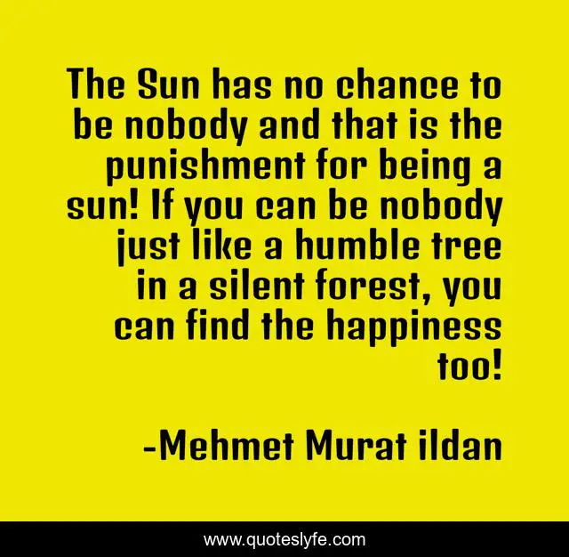 This page presents the quote "The Sun has no chance to be nobody and that is the punishment for being a sun! If you can be nobody just like a humble tree in a silent forest, you can find the happiness too!". Author of this quote is Mehmet Murat ildan. .