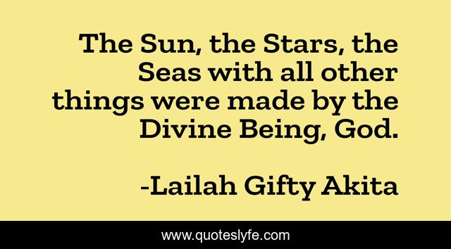 This page presents the quote "The Sun, the Stars, the Seas with all other things were made by the Divine Being, God.". Author of this quote is Lailah Gifty Akita. This quote is about sea, nature, god, wisdom, stars, science,.