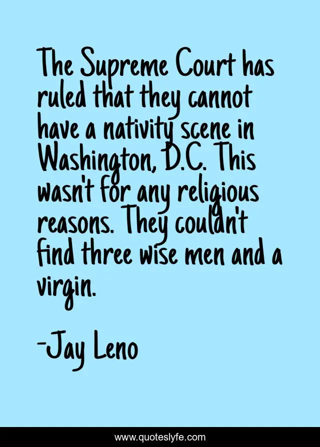 This page presents the quote "The Supreme Court has ruled that they cannot have a nativity scene in Washington, D.C. This wasn't for any religious reasons. They couldn't find three wise men and a virgin.". Author of this quote is Jay Leno. This quote is about washington, christianity, nativity, religion, corruption, politics, christmas,.