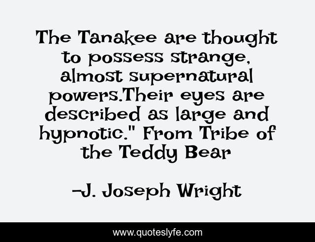 This page presents the quote "The Tanakee are thought to possess strange, almost supernatural powers.Their eyes are described as large and hypnotic." From Tribe of the Teddy Bear". Author of this quote is J. Joseph Wright. This quote is about giant, magic, sci-fi, science, spell, ted, dragon, supernatural, teddy-bear,.