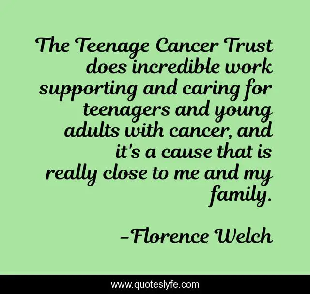 This page presents the quote "The Teenage Cancer Trust does incredible work supporting and caring for teenagers and young adults with cancer, and it's a cause that is really close to me and my family.". Author of this quote is Florence Welch. This quote is about caring, work, family,.