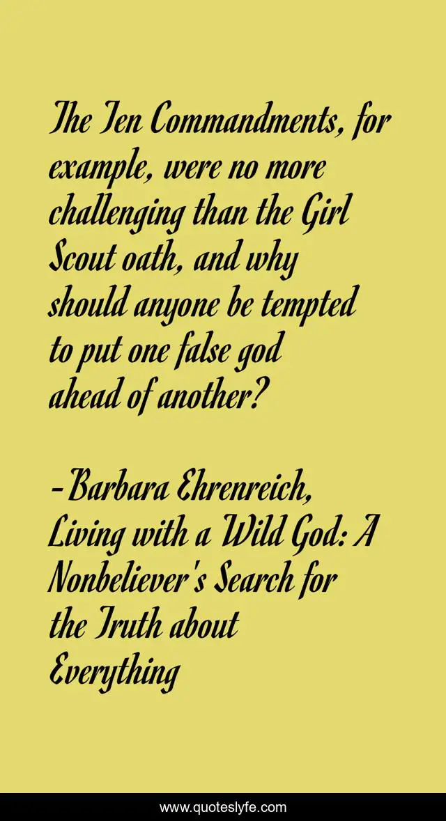 This page presents the quote "The Ten Commandments, for example, were no more challenging than the Girl Scout oath, and why should anyone be tempted to put one false god ahead of another?". Author of this quote is Barbara Ehrenreich, Living with a Wild God: A Nonbeliever's Search for the Truth about Everything. This quote is about atheism, ten-commandments,.