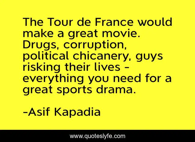 This page presents the quote "The Tour de France would make a great movie. Drugs, corruption, political chicanery, guys risking their lives - everything you need for a great sports drama.". Author of this quote is Asif Kapadia. This quote is about great, political, corruption,.