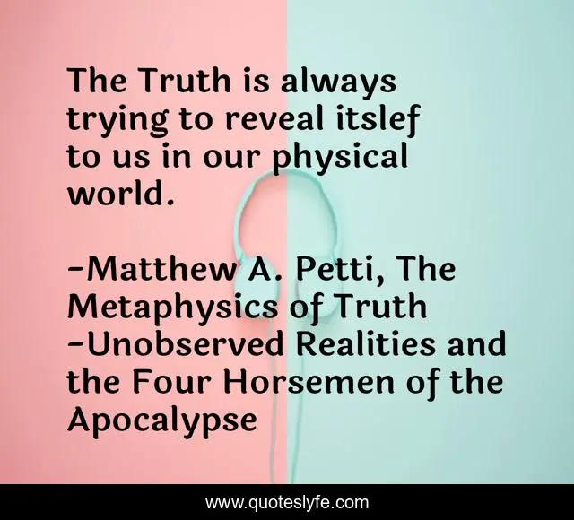 "Matthew A. Petti, The Metaphysics of Truth -Unobserved Realities and the Four Horsemen of the Apocalypse Quotes." Quoteslyfe.com, 2025. Sat. 06 Dec. 2025. <https://www.quoteslyfe.com/quote/The-Truth-is-always-trying-to-reveal-280835>.