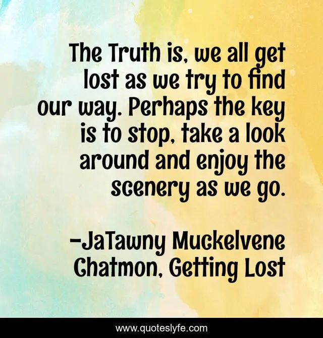 This page presents the quote "The Truth is, we all get lost as we try to find our way. Perhaps the key is to stop, take a look around and enjoy the scenery as we go.". Author of this quote is JaTawny Muckelvene Chatmon, Getting Lost. This quote is about finding-yourself, girls, encouragement, getting-lost, daughters, inspiration,.