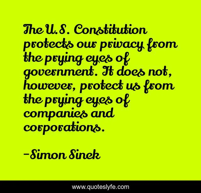 This page presents the quote "The U.S. Constitution protects our privacy from the prying eyes of government. It does not, however, protect us from the prying eyes of companies and corporations.". Author of this quote is Simon Sinek. This quote is about eyes, constitution, privacy,.