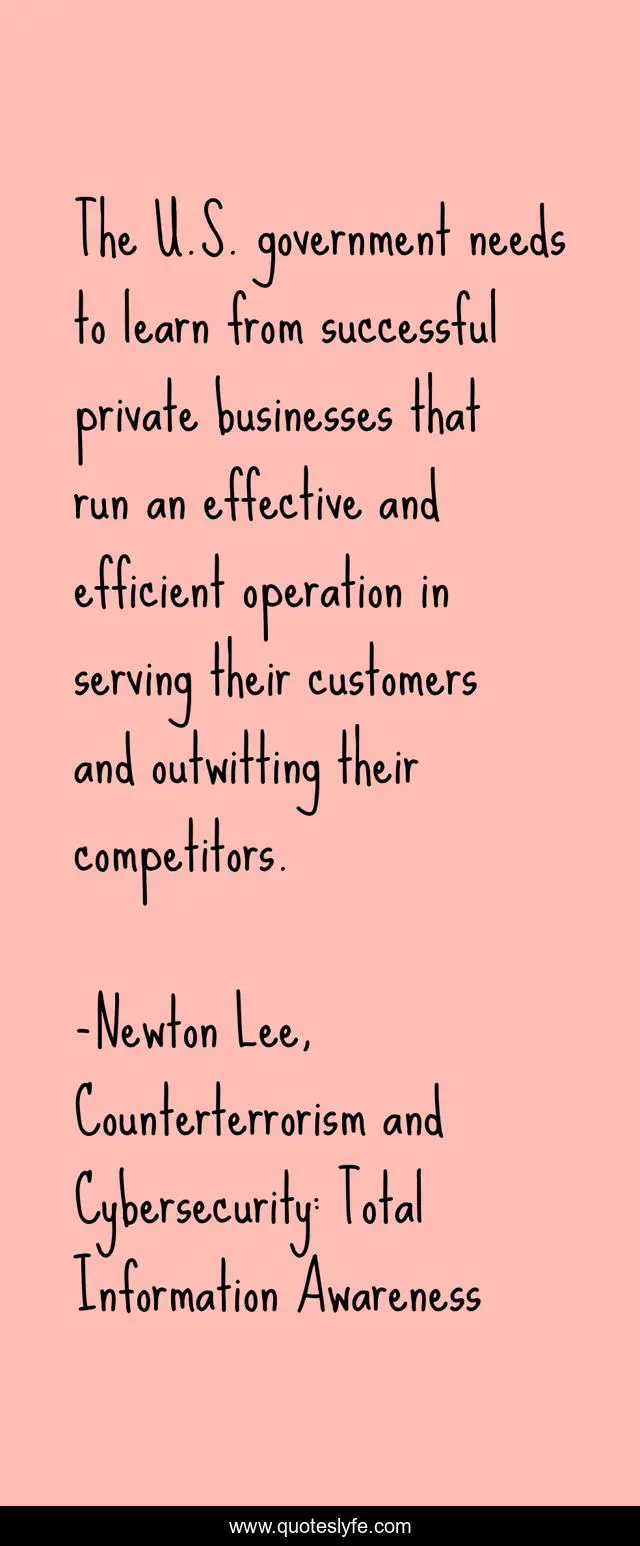 This page presents the quote "The U.S. government needs to learn from successful private businesses that run an effective and efficient operation in serving their customers and outwitting their competitors.". Author of this quote is Newton Lee, Counterterrorism and Cybersecurity: Total Information Awareness. This quote is about politics, government,.