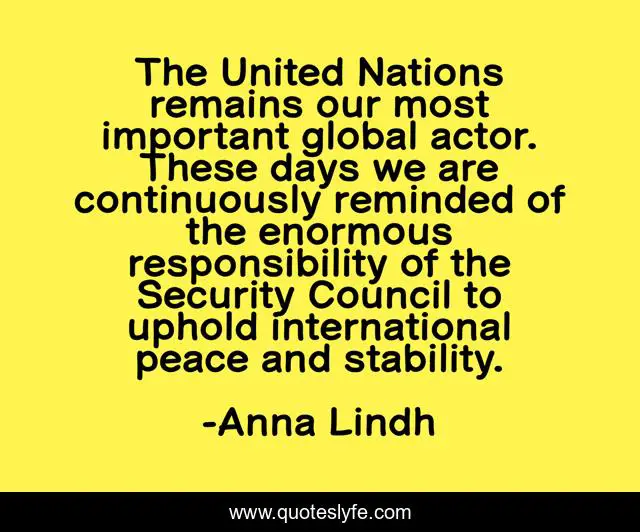 This page presents the quote "The United Nations remains our most important global actor. These days we are continuously reminded of the enormous responsibility of the Security Council to uphold international peace and stability.". Author of this quote is Anna Lindh. This quote is about security, responsibility,.