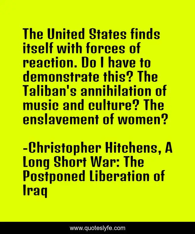 This page presents the quote "The United States finds itself with forces of reaction. Do I have to demonstrate this? The Taliban's annihilation of music and culture? The enslavement of women?". Author of this quote is Christopher Hitchens, A Long Short War: The Postponed Liberation of Iraq. This quote is about war-on-terror, culture, jihad, music, united-states, islamism, taliban, terrorism, islam,.