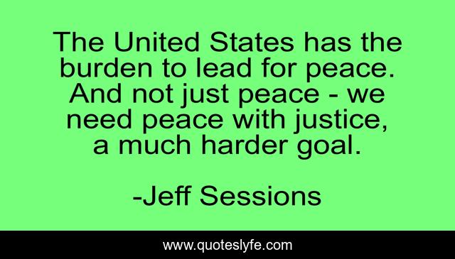 This page presents the quote "The United States has the burden to lead for peace. And not just peace - we need peace with justice, a much harder goal.". Author of this quote is Jeff Sessions. This quote is about justice, goal, lead,.
